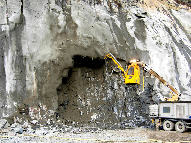O concreto projetado reforçado com fibra aplicado mecanicamente, como revestimento temporário ou permanente, elimina quase totalmente o risco de queda de rochas soltas e elimina a necessidade de os trabalhadores operarem sob um solo sem suporte.
