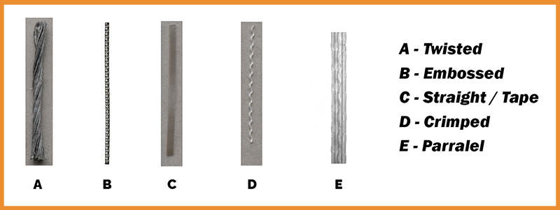 Macro synthetic fibres are manufactured in a range of geometries and surface profiles, each of which can affect mixing, finishing and performance properties. The most common types of macro synthetic fibre include: