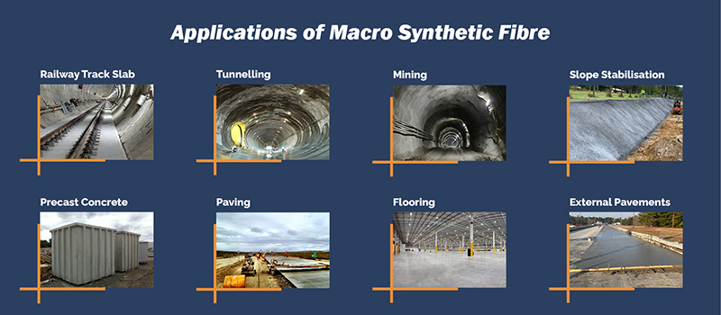 Macro synthetic fibres are widely used in applications such as industrial flooring, shotcrete, precast concrete, pavements and railway track slabs.