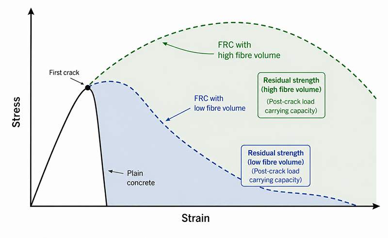 This mechanism is known as post-crack residual strength and is a key design parameter in fibre reinforced concrete.